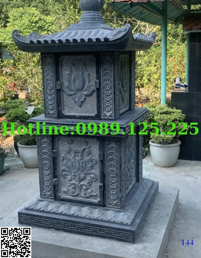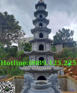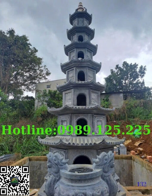 🌿 Phần Thân Tháp (Các Tầng Tháp): Đây là phần chính tạo nên hình dáng đặc trưng của mộ tháp. Thân tháp bao gồm nhiều tầng đá xếp chồng lên nhau, thu nhỏ dần về phía đỉnh. Số tầng thường là số lẻ như 3, 5, 7, 9 tầng. Mỗi tầng có thể có mái nhỏ (đao) vươn ra ngoài, tạo điểm nhấn và che chắn. Trên các tầng tháp, nghệ nhân thường chạm khắc các hoa văn tinh xảo mang đậm nét Phật giáo như hoa sen, mây, chữ Hán, hoặc các biểu tượng tứ quý, tứ linh, tùy theo yêu cầu và ý nghĩa mong muốn của gia chủ. Đây cũng là nơi có thể đặt di ảnh, bia mộ, hoặc các vật phẩm thờ cúng nhỏ.